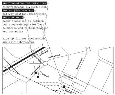 Auf den meisten Mobile Phones (u.a. auch iPhone) wird nur die Karte angezeigt, nicht aber die Ortsmarkierungen. Wer dennoch will, hier gehts zu Google Maps. Weitere Seiten zu #004 Informationen zu #004 | Spéculations/Spekulationen Zur Arbeit von Simone Zaugg Zur Arbeit von Muriel Baumgartner Zur Arbeit von Domenico Billari #004 Video (folgt in Kürze) #004 Karte #005 Reader (mit Textbeiträgen auch zu Spéculations/Spekulationen)